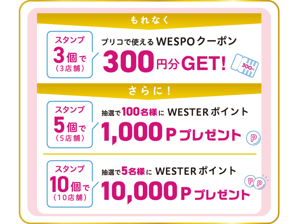 スタンプ3つ集めるともれなく、プリコで使えるWESPOクーポンプレゼント!