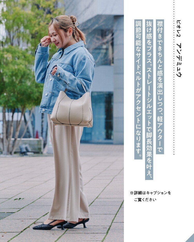 ストレートシルエットで脚長効果を叶え、調節可能なサイドベルトがアクセントになります。