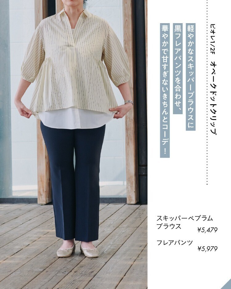 軽やかなスキッパーブラウスに🍃黒フレアパンツ🖤を合わせ、華やかで甘すぎないきちんとコーデ👍