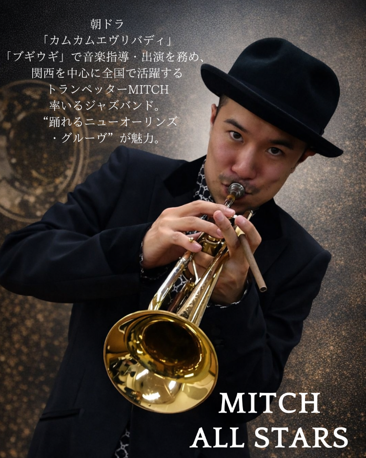 朝ドラ「カムカムエヴリバディ」「ブギウギ」で音楽指導・出演を務め、 関西を中心に全国で活躍するトランぺッター MITCH。 “ニューオリンズ・ジャズの第一人者”として知られる実力派。